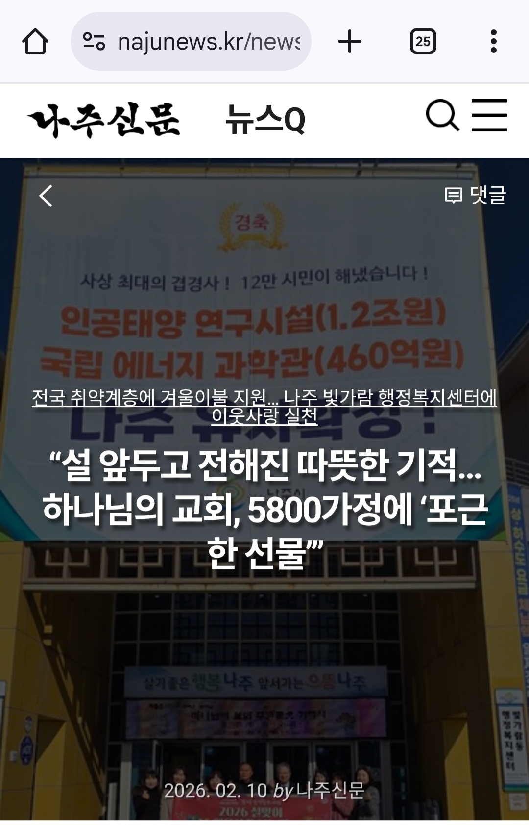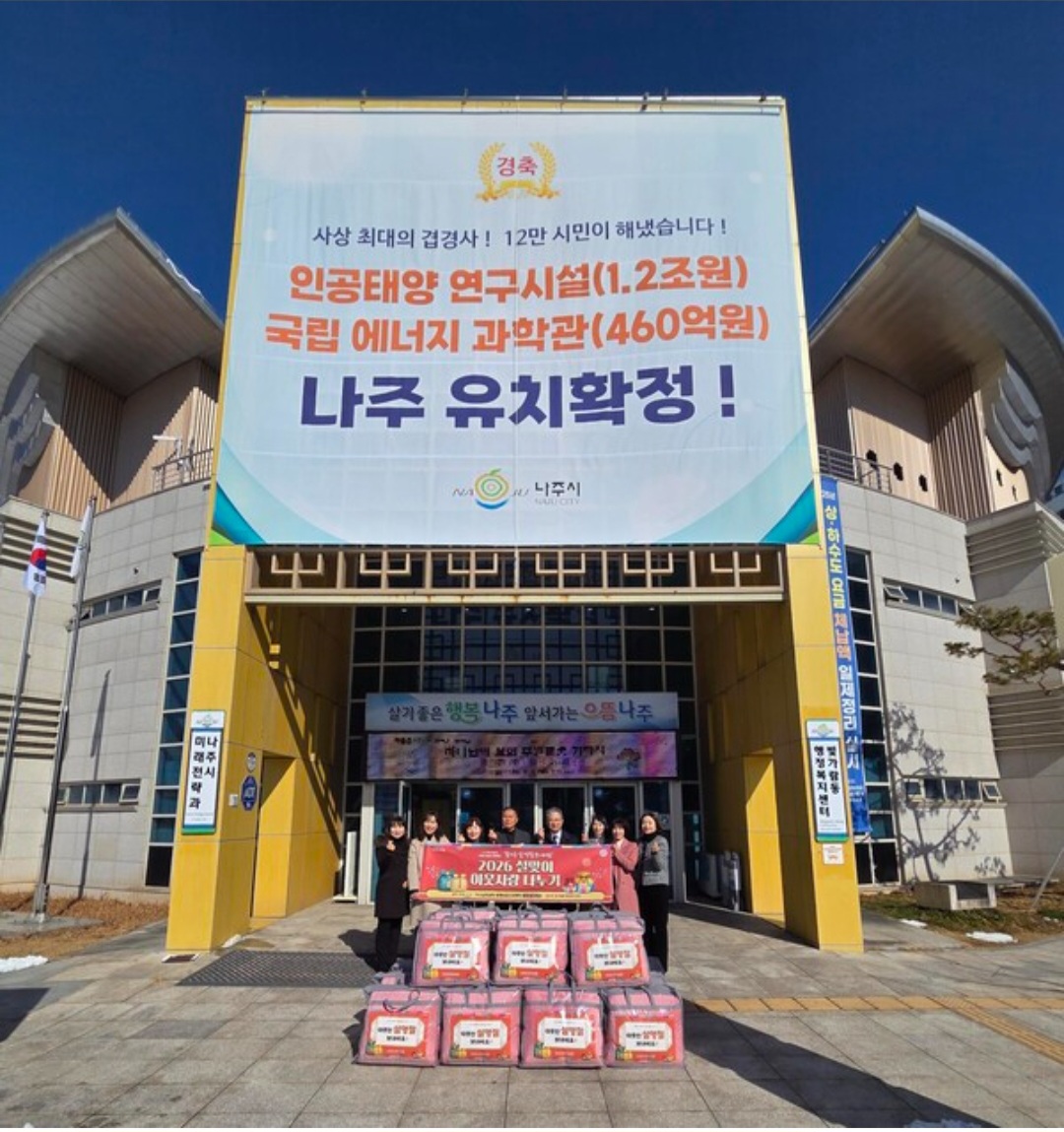 나주빛가람 하나님의 교회 신자들이 9일 빛가람동 행정복지센터를 방문해 겨울이불 20채를 전달했다. 이들을 반갑게 맞이한 김귀남 동장은 “매번 명절때마다 기부해 주셔서 감사합니다. 이웃분들에게 따뜻한 명절 보내시라고 잘 전달해 드리겠습니다”고 인사했다. 이날 전한 물품은 홀몸어르신, 다문화, 청소년가장, 장애인 가정 등 관내 어려운 이웃에 골고루 전해질 예정이다. 교회 관계자는 “사회가 각박해질수록 서로를 돌아보는 마음이 더욱 소중하게 느껴진다. 이런 때에 어머니의 마음으로 이웃과 가족의 정을 나누고 위로를 전하고자 성도들이 정성껏 명절선물을 준비했다”고 말했다.