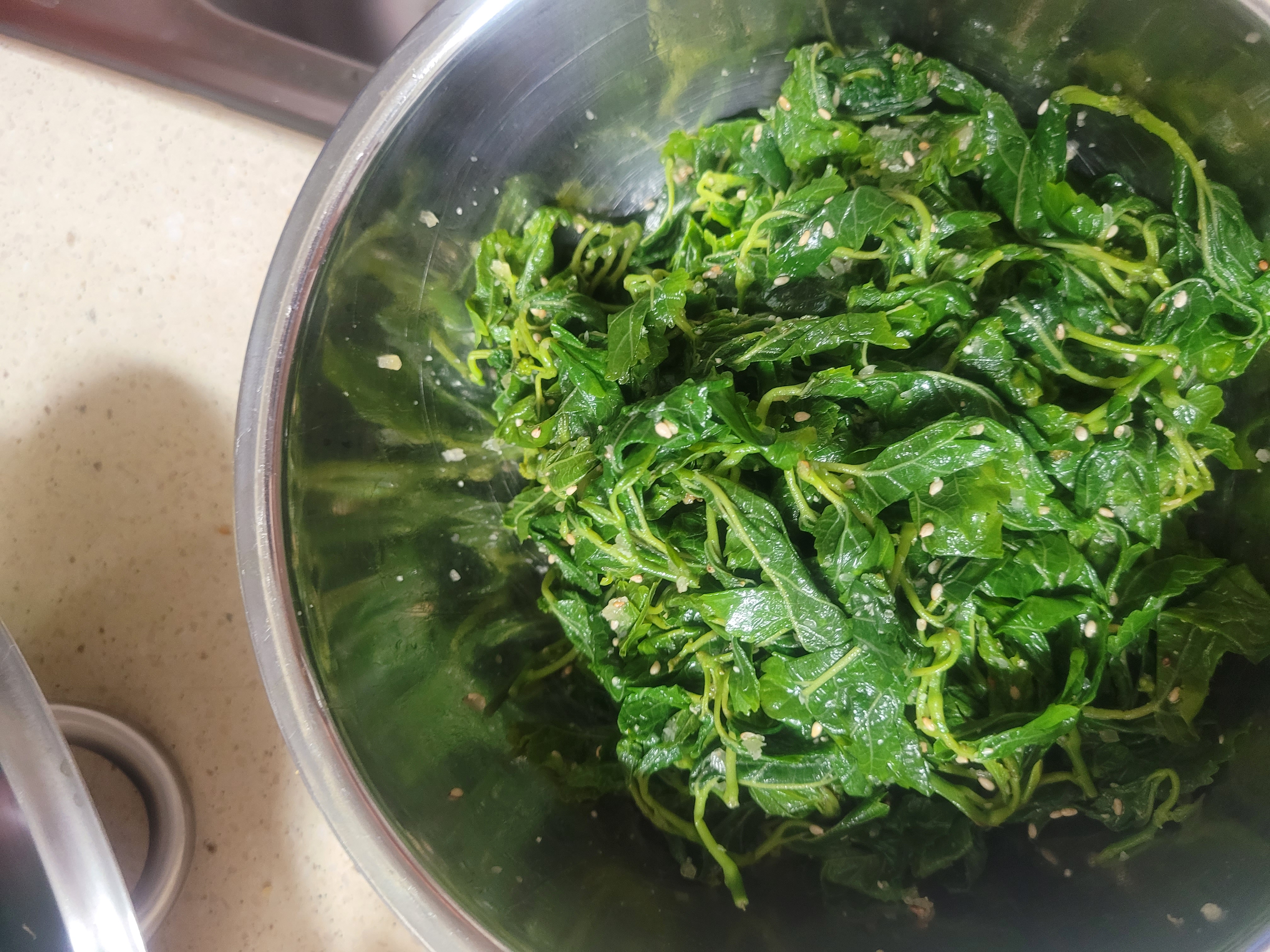 오늘 냉동실에 얼려 두었던 뽕잎을 꺼내서 무쳐 보았어요~^^