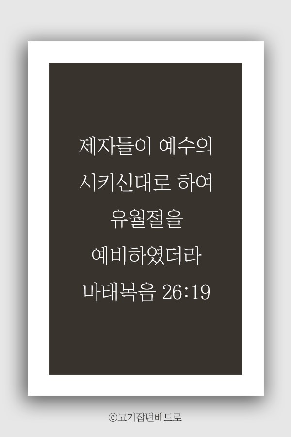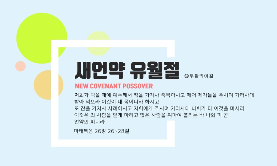 성찬식을 행할 때마다 무엇을 전한다고 하였습니까? 예수님의 죽으심을 전하는 것이라고 하였습니다. 다시 말해 떡과 포도주를 통해 예수님께서 십자가에서 찢기신 살과 십자가에 흘리신 피를 기억하며, 그리스도의 희생과 사랑을 가슴에 새기는 예식이 유월절 성찬식인 것입니다. 그런데도 세상 교회는 엉뚱하게 부활 때문에 지키는 날에 성찬식을 행하고 있으니, 이 얼마나 잘못된 일입니까?