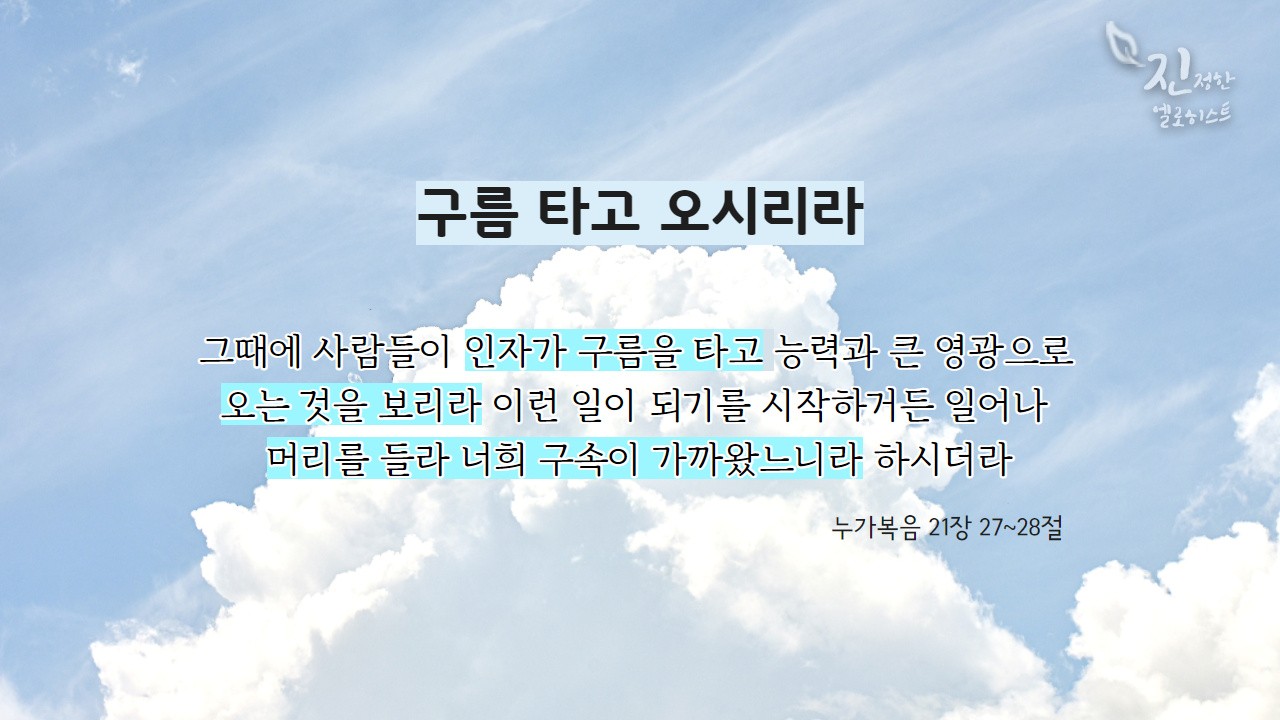 눅 21 : 27 ~ 28 그때에 사람들이 인자가 구름을 타고 능력과 큰 영광으로 오는 것을 보리라 이런 일이 되기를 시작하거든 일어나 머리를 들라 너희 구속이 가까왔느니라 하시더라