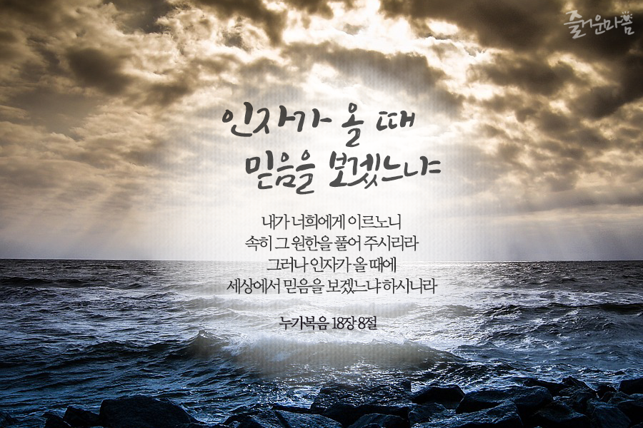 눅18 : 8 내가 너희에게 이러노니 속히 그 원한을 풀어 주시리라 그러나 인자가 올 때 세상에서 믿음을 보겠느냐 하시니라
