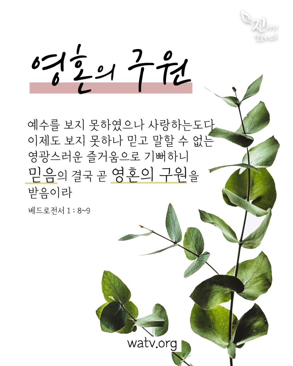벧전 1 : 8 ~ 9 예수를 너희가 보지 못하였으나 사랑하는도다 이제도 보지 못하나 믿고 말할 수 없는 영광스러운 즐거움으로 기뻐하니 믿음에 결국 곧 영혼 구원을 받음이라