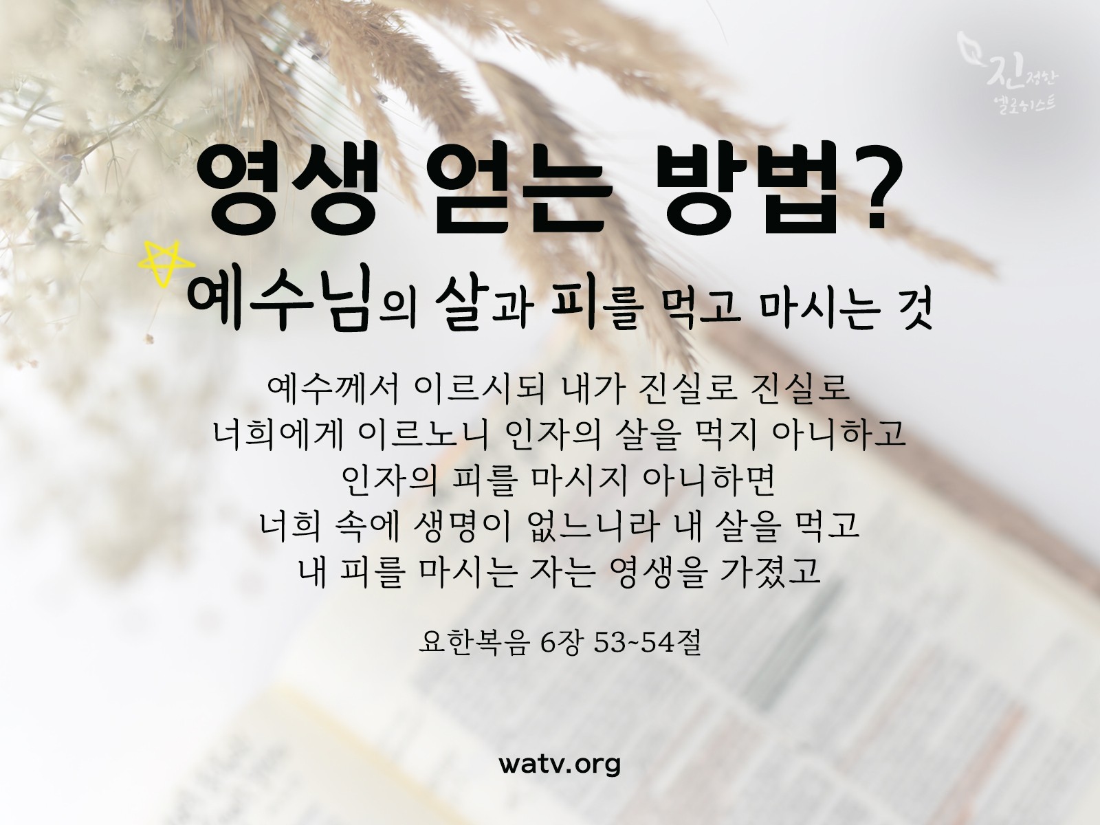 요한복음 6장 53 ~54절 인자의 살을 먹지 아니하고 인자의 피를 마시지 아니하면 너희 속에 생명이 없느니라 내 살을 먹고 내 피를 마시는 자는 영생을 가졌고